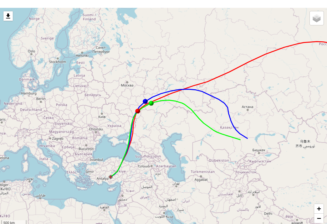 Doing a new prediction using these starting lat/long points 1025, 40.5880, 50.9080, 254. 2025, 42.7470, 52.6150, 227. 3025, 44.4120, 52.2830, 240.